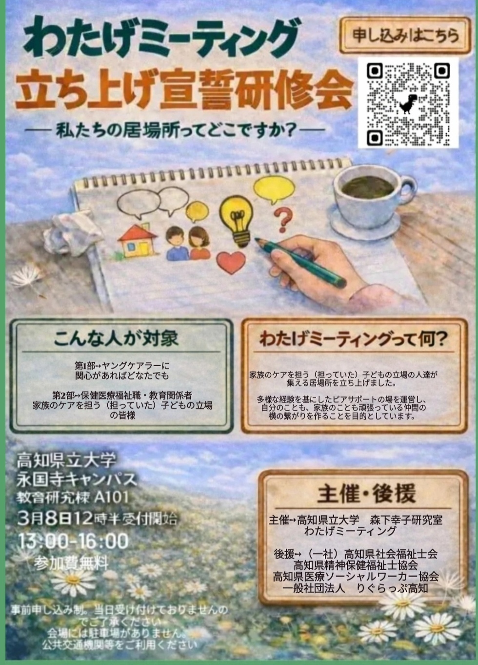 首都圏には家族のケアを担う子ども・若者を支える選択肢がありますが、地方では十分とは言えず、孤立を深める現状があります。そこで高知に「わたげミーティング」を立ち上げました。仲間との横のつながりを通して、自分らしい一歩を後押しする場を目指します。その第一歩として、2026年3月8日に関西圏でヤングケアラー支援を行うNPO法人ふうせんの会の皆様をお招きし、立ち上げ宣誓研修会を開催します。