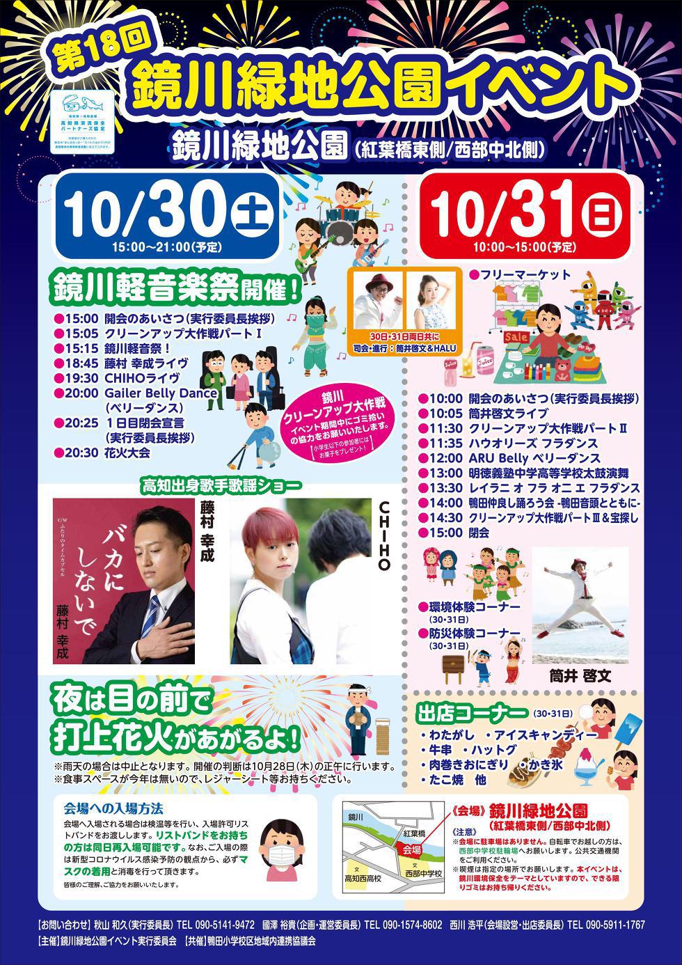 ステージショーや打ち上げ花火が楽しめる「第 18 回鏡川緑地公園イベント」が 2021 年 10 月 30 日(土)、31 日(日)、高知市の西部中学校北側にある鏡川緑地公園で開かれます。鏡川の環境保全を目的に毎年開催されているイベントです。