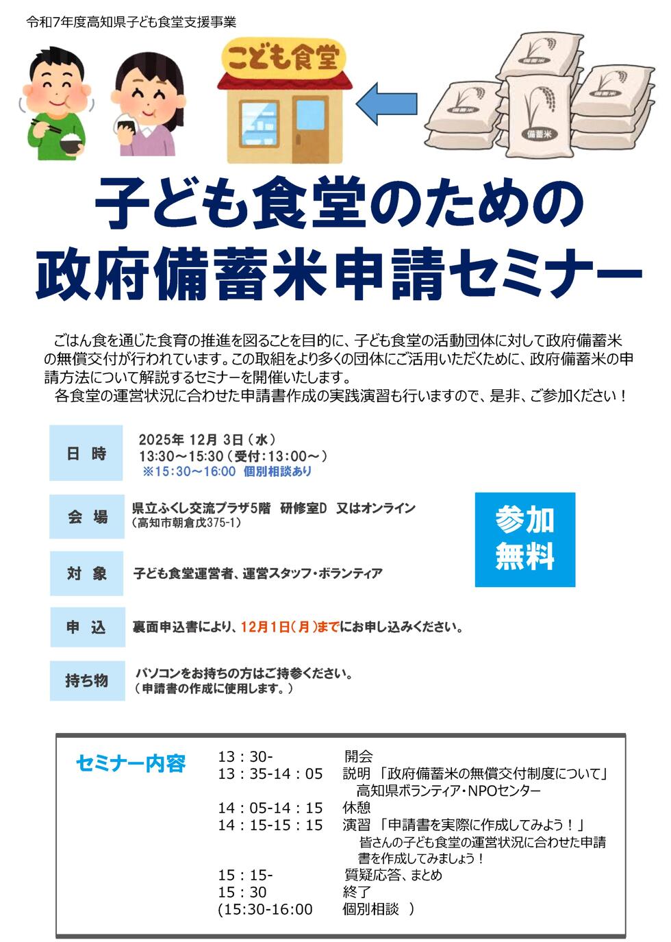ごはん食を通じた食育の推進を図ることを目的に、子ども食堂の活動団体に対して政府備蓄米の無償交付が行われています。この取組をより多くの団体にご活用いただくために、政府備蓄米の申請方法について解説するセミナーを開催いたします。